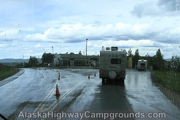 The first town you come to after crossing the Alaska Canada border on the Alaska Highway is Border City, Alaska. While not really a town it does offer you the first chance to fuel up with lower cost U.S. fuel prices. Border City, Alaska located at Milepost 1225.5 Alaska Highway is actually more of a one stop shop reminiscent of the old roadhouses of past; there is camping, lodging, restaurant and fuel all available in one convenient location.